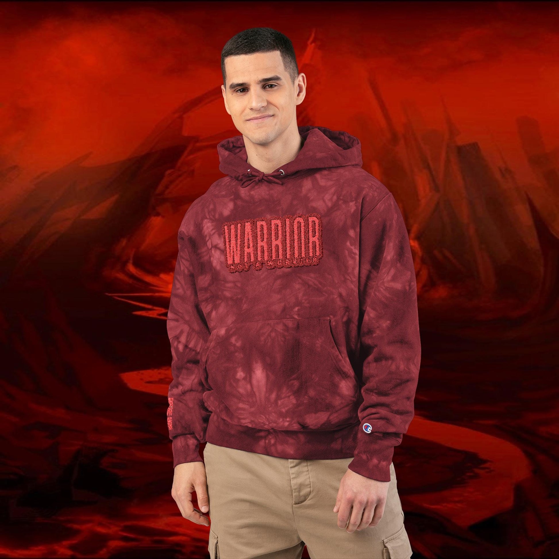 A trendy Unisex Champion Tie-Dye Hoodie with embroidery, part of a collection perfect for fans of upcoming artist Liulf Lucifer. This hoodie provides a unique and vibrant style, perfect for casual wear or showing off at music events. Ideal for adults looking to stand out and stay cozy during concerts, festivals, and music gatherings.